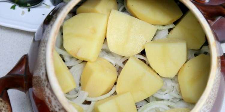 На дно горшка выложить сначала обжаренную баранину, которую сверху следует полить соком из сковороды.