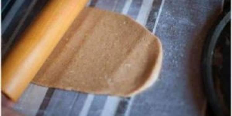 шаг 10Через 15 минут, когда тесто уже достаточно охладится, вынимаем его, отрезаем примерно 1/2 и раскатываем в овальный пласт высотой около 5 мм. Если у вас большой противень, на который поместится все печенье, тесто делить пополам не надо: раскатывайте его все. Но обычно печенье выпекается порциями.