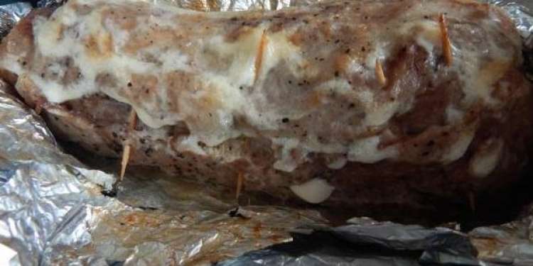 шаг 7Затем необходимо аккуратно завернуть мясо рулетом. Нужно стараться, чтобы наполнение не вылезло наружу. Чтобы конструкция не разворачивалась, ее можно зафиксировать зубочистками. Далее наш рулет нужно обернуть фольгой. В разогретый до 180°С духовой шкаф необходимо отправить форму для запекания с заготовкой из мяса, обернутую фольгой, на 40 минут. Чтобы лакомство равномерно пропеклось и не пригорело, можно под противень поставить поддон с водой (по желанию).