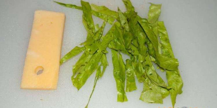 Листья салата нарежьте длинными полосками, а из твердого сыра вырежьте небольшой прямоугольник, который будет основой нашей свечи.