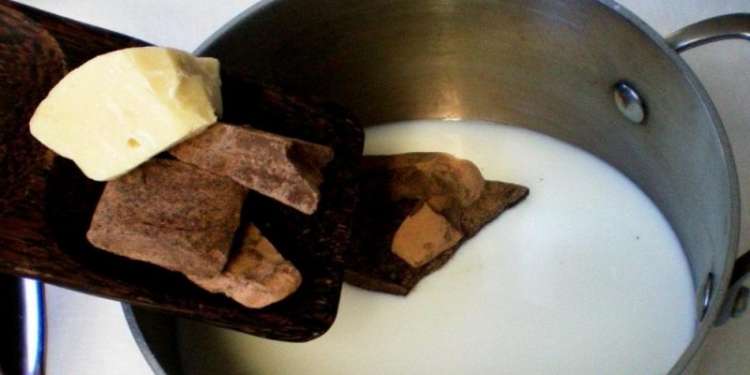 шаг 8Приступаем к приготовлению крема. Для этого в мисочку наливаем молоко и отправляем его нагреваться на плиту. В молоко добавляем какао-масло и какао-порошок (можно темный шоколад). В процессе нагревания смесь нужно будет помешивать.