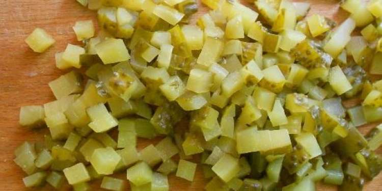шаг 10Возьмите необходимое количество консервированных огурцов, промойте их, оботрите чистым полотенцем и нарежьте небольшими кубиками.